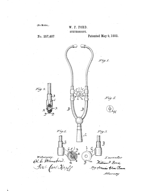 Image: 1882 United States Patent for a Stethoscope. Courtesy of the United States Patent and Trademark Office. Public Domain.