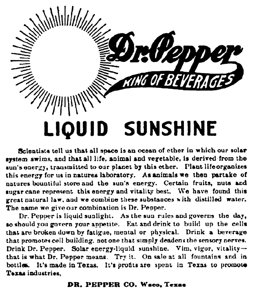Image 2: Advertisement for Dr. Pepper. The formula for Dr. Pepper is a well-kept trade secret. Public Domain.